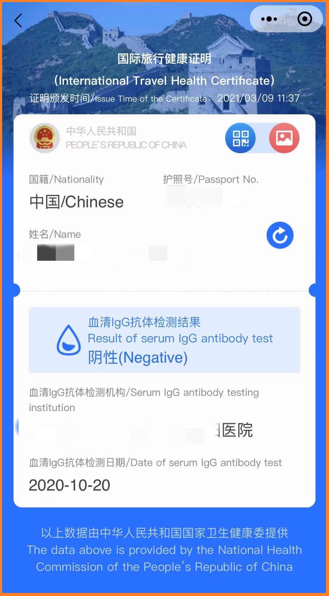 中国版“国际旅行健康证明”是一种综合性证明,展示持有人的核酸、血清IgG抗体检测结果及疫苗接种情况等。