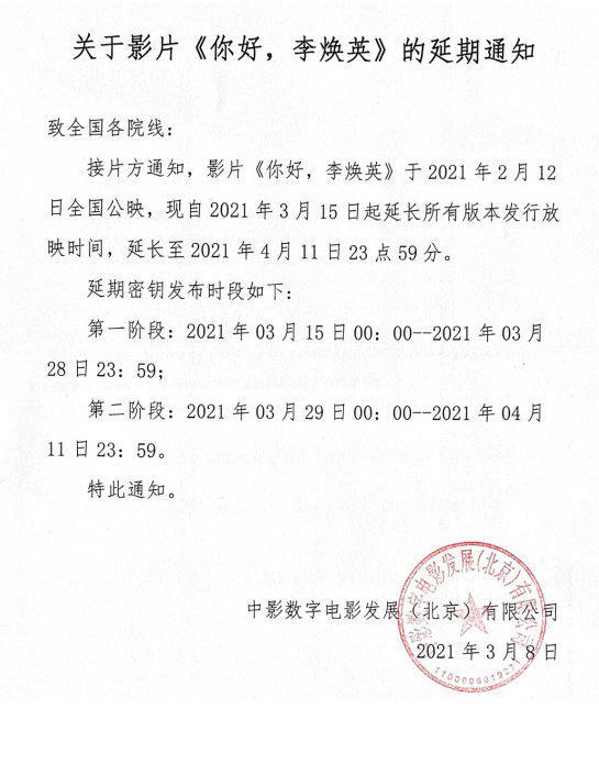 3月9日,据电影《你好,李焕英》官方微博消息,电影《你好,李焕英》将延长放映至2021年4月11日。影片自2月12日起公映,目前票房已突破51亿。