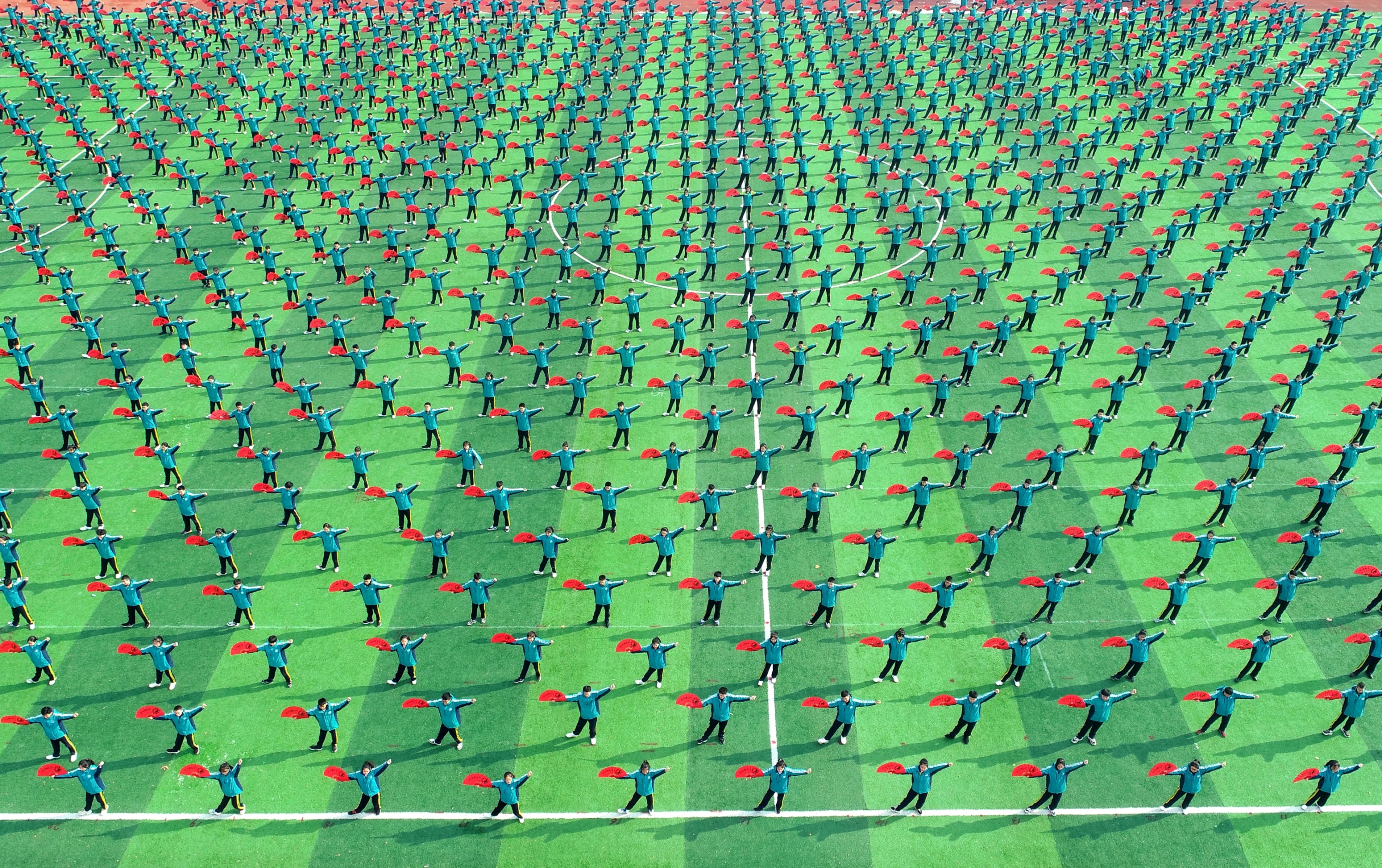 1月5日,山东省青岛市通济实验学校的学生在大课间打太极扇(无人机照片)。新华社发(梁孝鹏摄)