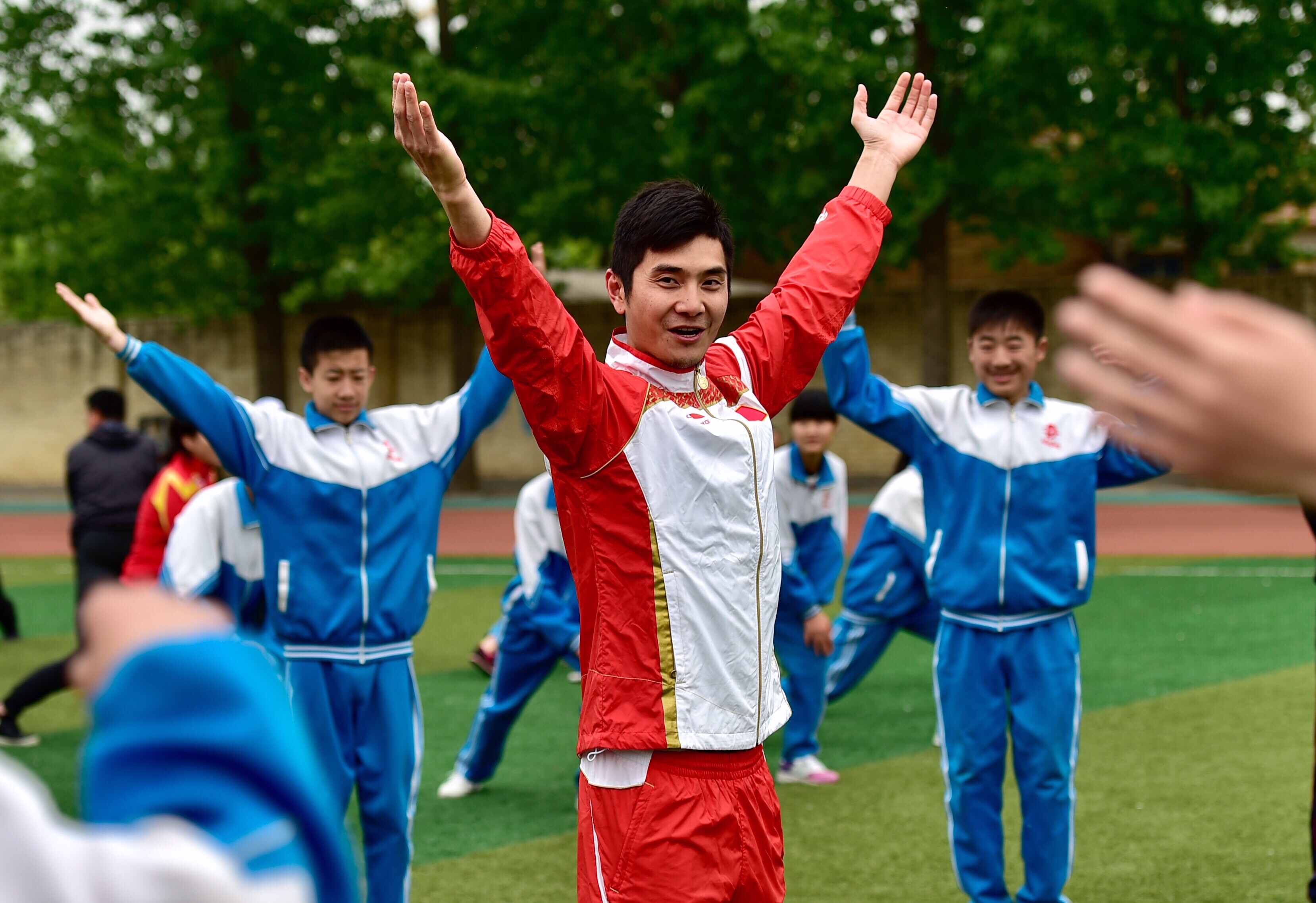 2017年4月19日,奥运冠军邢傲伟(中)带领学生上体育公开课。新华社记者岳月伟摄