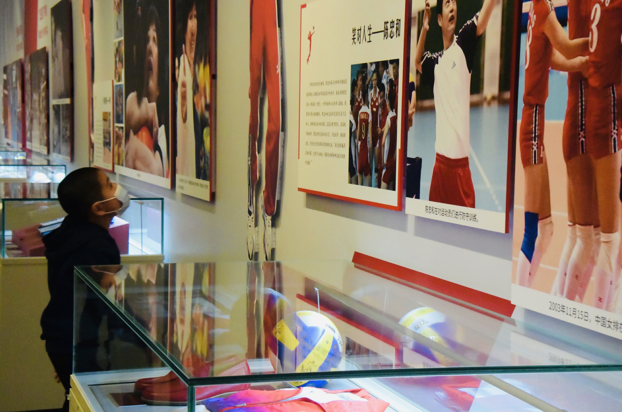 2月14日,小朋友在天津美术馆推出的《国家荣誉—中国女排精神展》上参观。新华社记者周润健摄