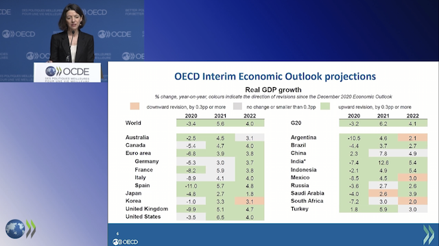 总部位于法国巴黎的经济合作与发展组织(OECD)当地时间3月9日发布了最新的中期经济展望报告。该报告指出,近几个月来,得益于全球范围内新冠疫苗的有效部署,一些国家宣布增加财政预算,全球经济前景得到显著改善。预计2021年全球GDP增长率为5.5%,2022年为4%。到2021年年中,全球经济产出将超过新冠疫情大流行前的水平。即便全球经济前景有所改善,但许多国家的产出和收入到2022年底之前将维持在新冠疫情全球大流行之前的预期水平以下。