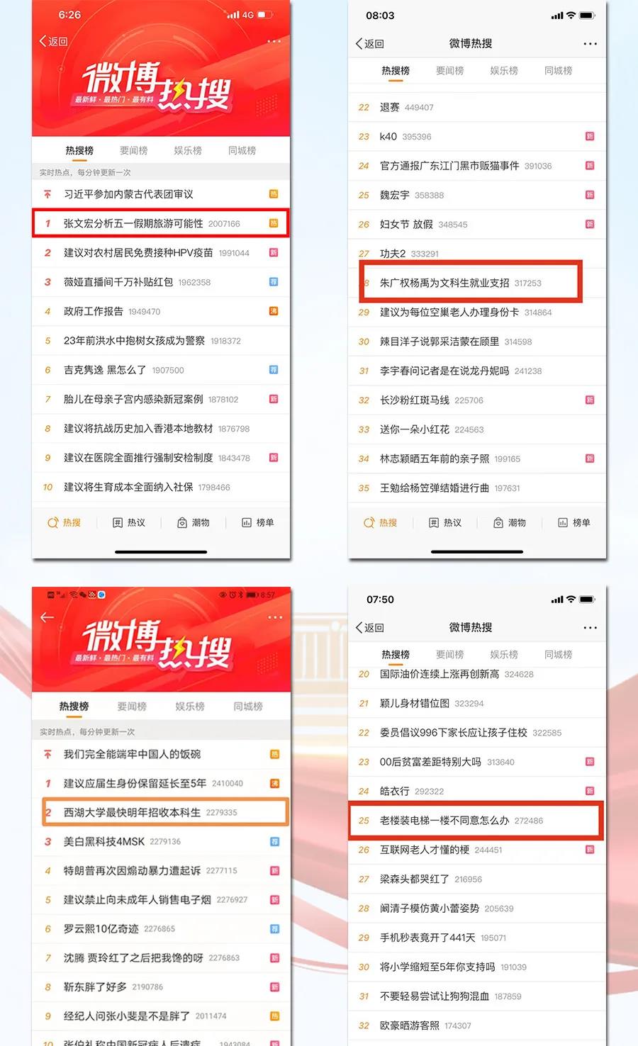 这几天,中央广播电视总台两会融媒体特别节目《两会你我他》刷屏了。#张文宏分析五一假期旅游可能性# #西湖大学最快明年招收本科生# #朱广权杨禹为文科生就业支招# #老楼装电梯一楼不同意怎么办#等节目话题连续冲上微博热搜。