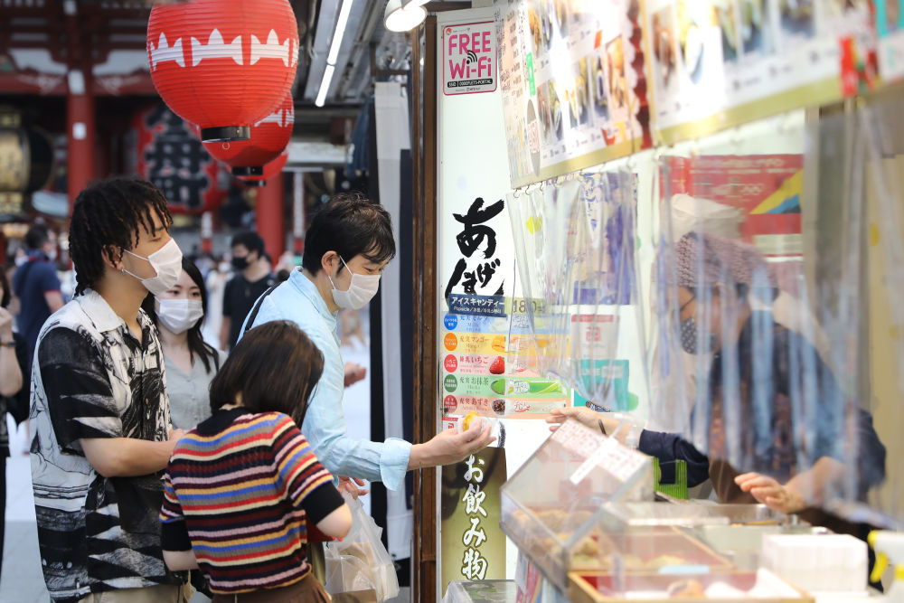2020年6月21日,在日本东京,游客在浅草景区的商店街上购买食品。(新华社记者杜潇逸摄)