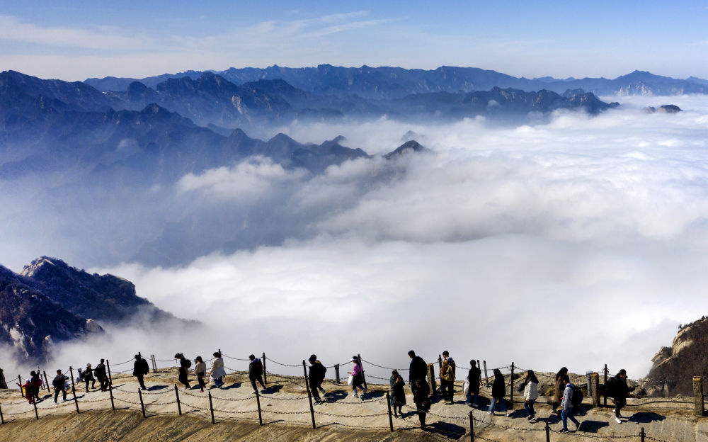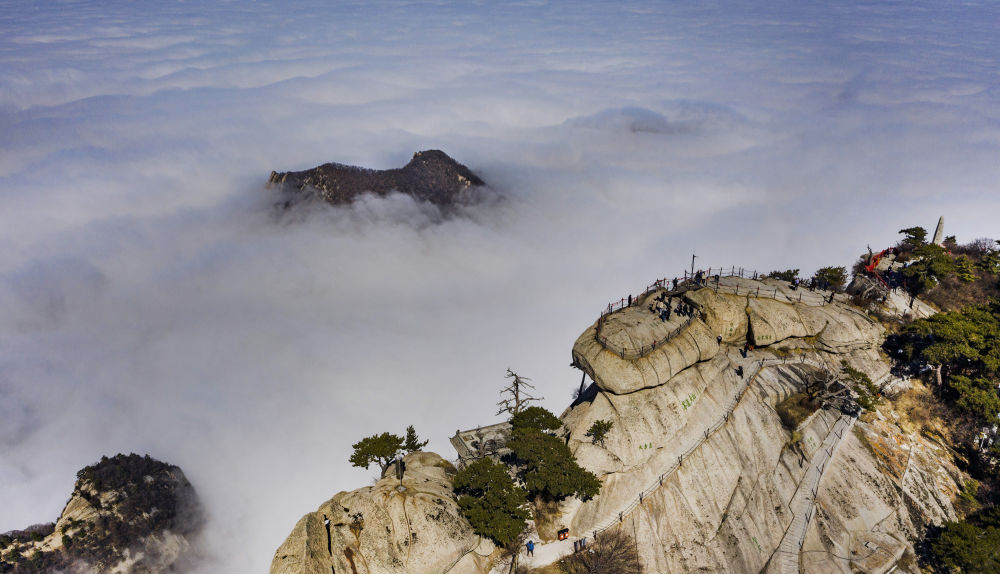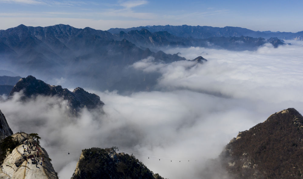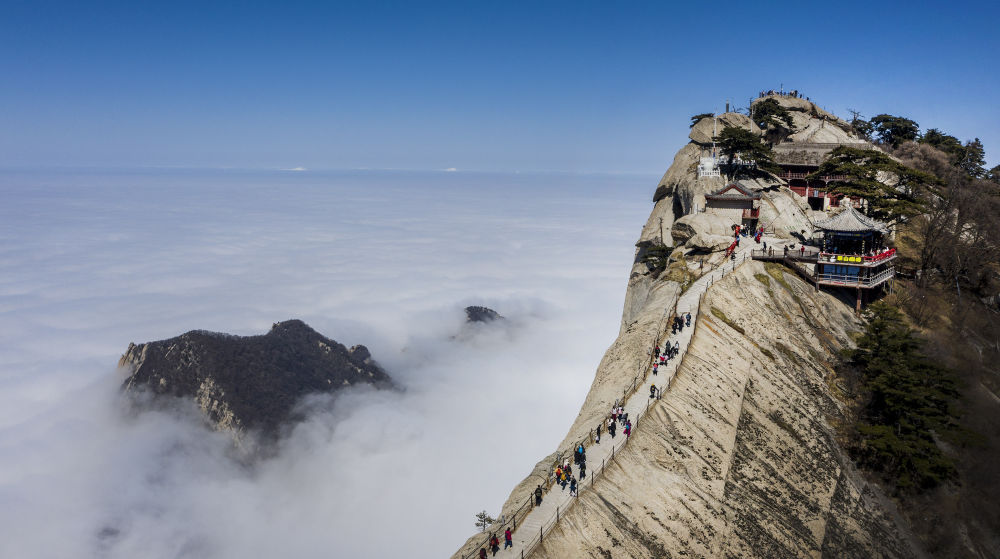 ↑ 3月9日,游人在华山西峰游览(无人机照片)。