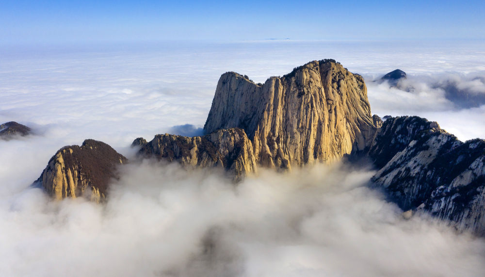 ↑3月9日拍摄的云雾中的华山西峰(无人机照片)。