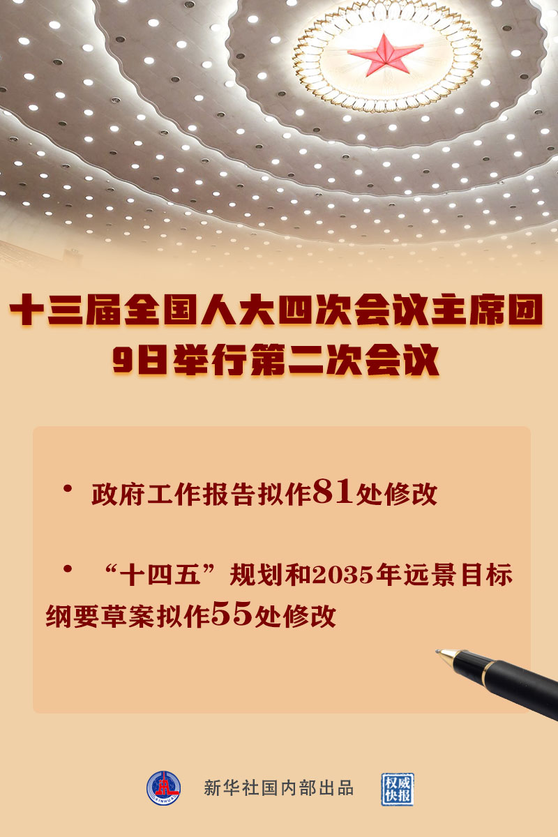 记者9日从十三届全国人大四次会议主席团第二次会议上获悉,政府工作报告拟作81处修改,“十四五”规划和2035年远景目标纲要草案拟作55处修改。详情>>>
