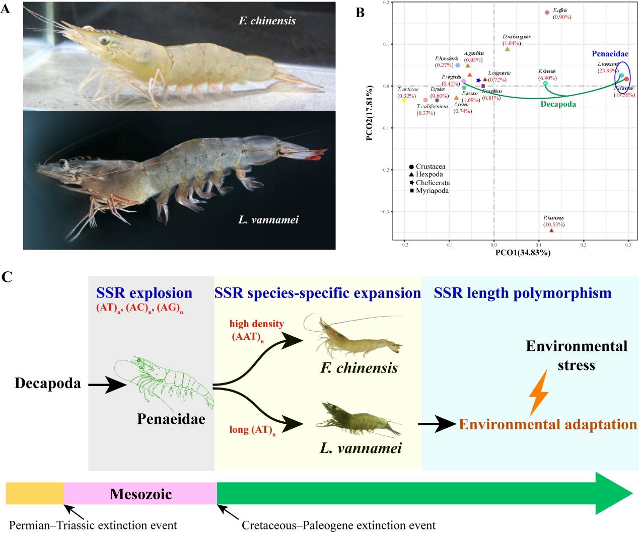 为了探究SSR的分布特征和功能,研究人员完成了另一种对虾——中国明对虾——的全基因组测序和组装,并基于Hi-C测序,构建了凡纳滨对虾和中国明对虾染色体水平的基因组图谱。通过比较基因组学分析,推断SSR的爆发式扩张发生在对虾的祖先基因组上,而SSR的特异性扩张也出现在不同对虾分化之后。SSR的扩张事件也与生物大灭绝事件后对虾的快速进化时间一致,提示了SSR在对虾适应性进化过程中的关键作用。