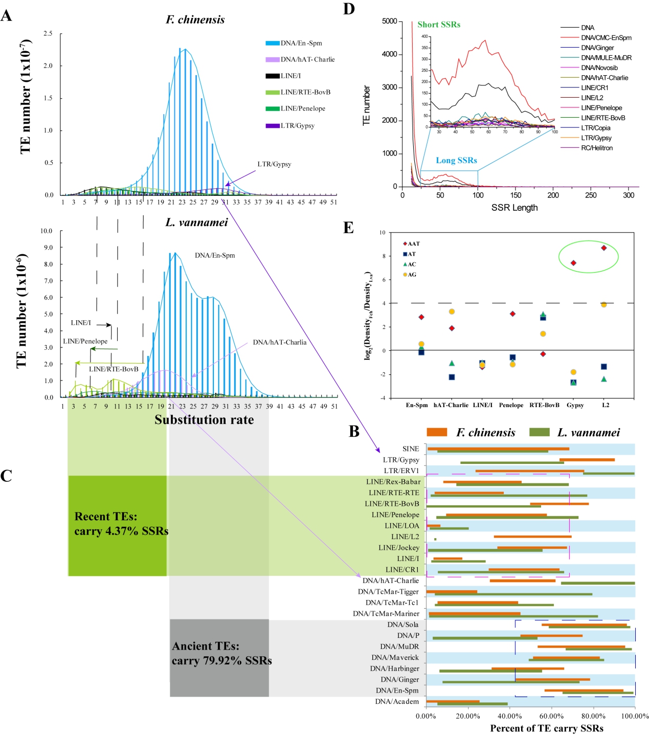 SSR是由1~6个碱基串联重复多次形成,在所有已测基因组物种中含量普遍较低(仅约1%左右),而且它们通常被认为是没有功能的,属于基因组上的“垃圾DNA”。然而,该课题组前期研究发现凡纳滨对虾基因组SSR含量竟高达23.93%,引发了研究人员对于SSR在对虾进化中的功能及作用机制的浓厚兴趣。