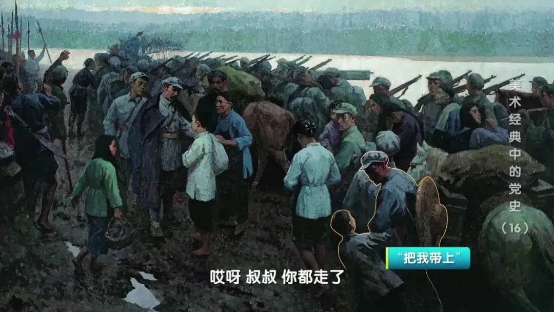 看到这一幕,似乎能感觉到孩子跟红军战士平时很熟悉,因此在战士出发之际,小孩拉着他的手,仿佛在说“叔叔你要走了,把我也带上吧?”