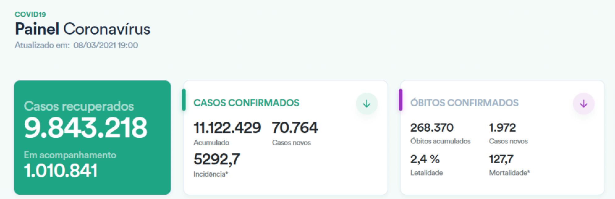 截至当地时间3月9日,巴西累计新冠肺炎确诊病例11122429例,较前一日新增70764例;累计死亡病例268370例,较前一日新增1972例,是疫情暴发以来巴西单日死亡人数最高纪录。