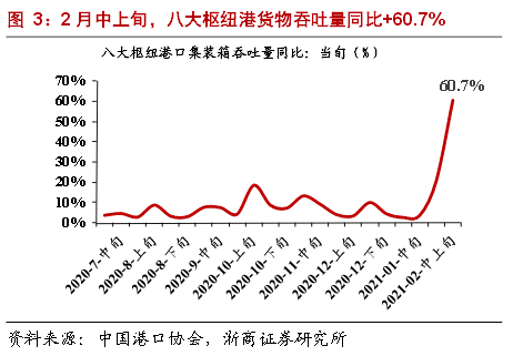 需求端来看,春节后箱量恢复早于往年,企业复工加快。中国港口协会统计数据显示,2月,八大枢纽港口集装箱吞吐量较2020年2月增长37.2%,较2019年增长9.9%。其中,外贸增长37.9%,内贸增长34.7%。海关数据显示,今年前两个月我国货物贸易进出口总值5.44万亿元人民币,比去年同期增长32.2%,再超预期。另外,供给端方面,中金公司数据指出,闲置船一直处于低位(仅占总运力的1%),春节期间运力停航远少于往年,但运价基本没有下跌,节后随着囤积货源的减少,运价有所回落,美线依然强势。(完)