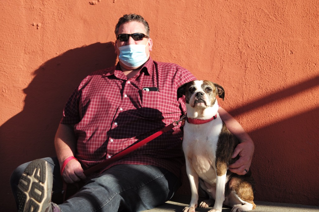 3月6日,一名男子在美国加利福尼亚州米尔布雷带着狗在街头晒太阳。(新华社记者吴晓凌摄)
