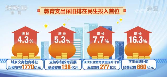 根据预算报告,城乡义务教育补助经费安排1770亿元,增长4.3%;支持学前教育发展资金安排198亿元,增长5.3%;现代职业教育质量提升计划资金安排277亿元,增长7.7%;学生资助补助经费安排660亿元,增长16.3%。教育支出依旧排在民生投入的首位。
