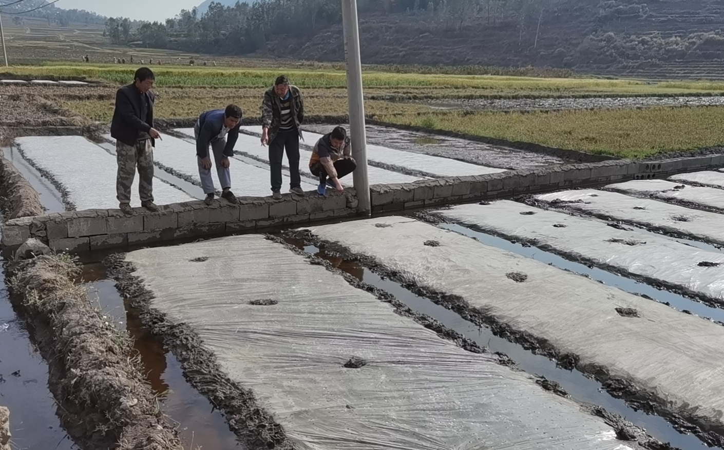 3月9日,云南省寻甸县金源乡金源村村干部查看覆膜后的育秧田。(通联照片)