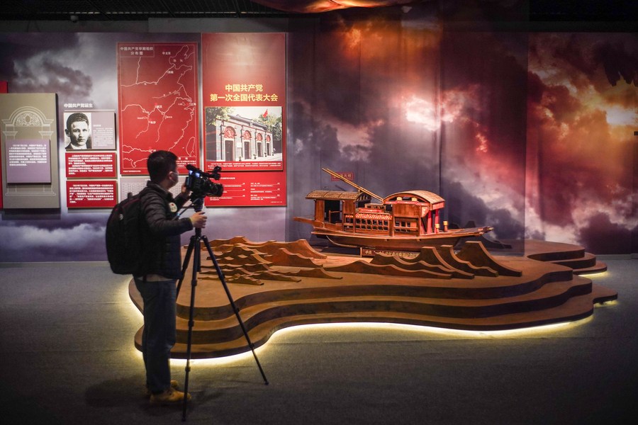 3月9日,首都博物馆三层D展厅内,一位记者正在拍摄中共一大会址嘉兴南湖红船的模型。新华社记者 彭子洋 摄