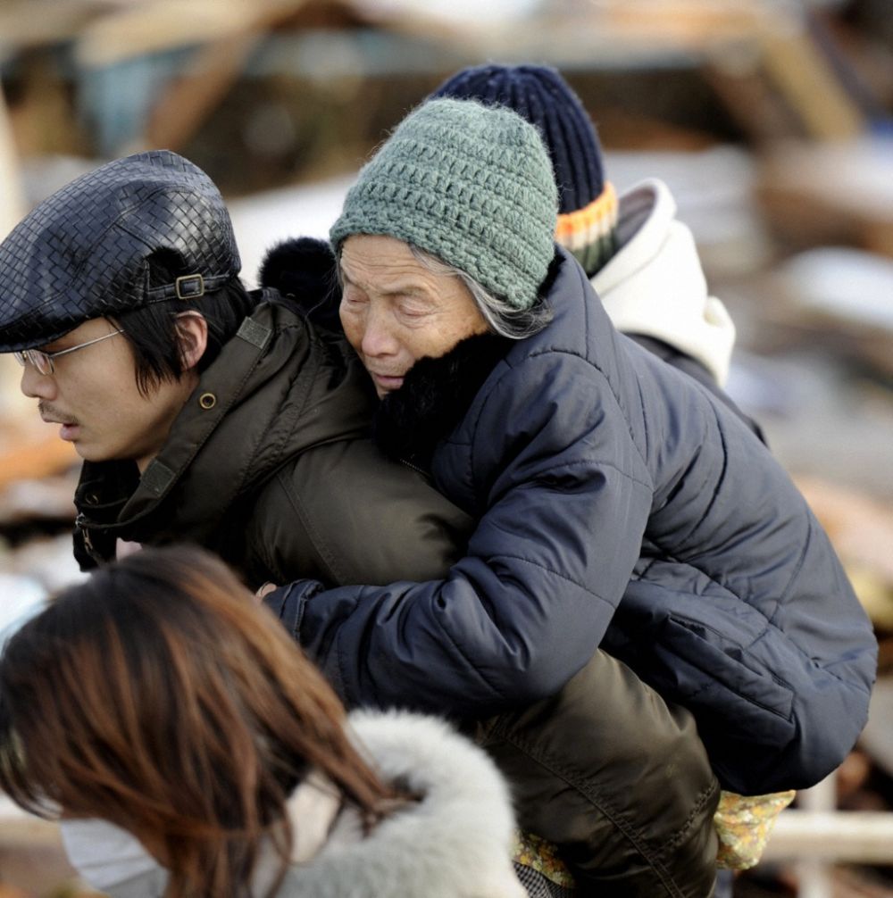 2011年3月12日,在日本宫城县仙台市,一名青年男子背着老人撤离。(新华社/共同社)