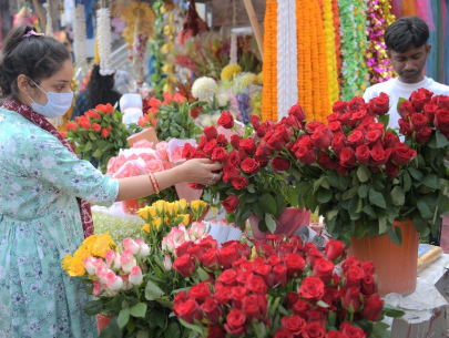 图为印度阿加尔塔拉的一名女孩在鲜花店挑选玫瑰。