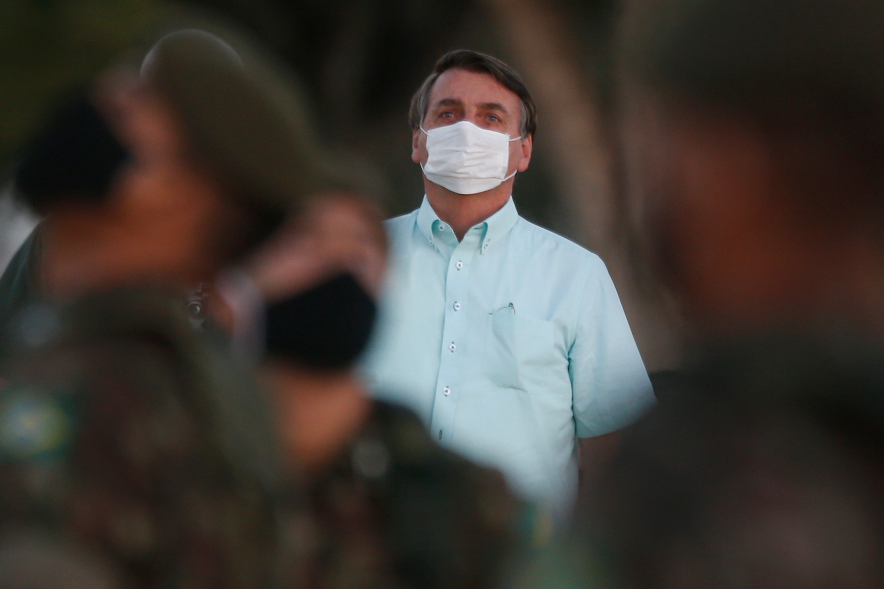 2020年7月22日,巴西总统博索纳罗在首都巴西利亚的总统官邸参加升旗仪式。7月7日,博索纳罗宣布自己感染新冠病毒,随后在医学团队的陪伴下于总统官邸办公。(新华社发,卢西奥·塔沃拉摄)