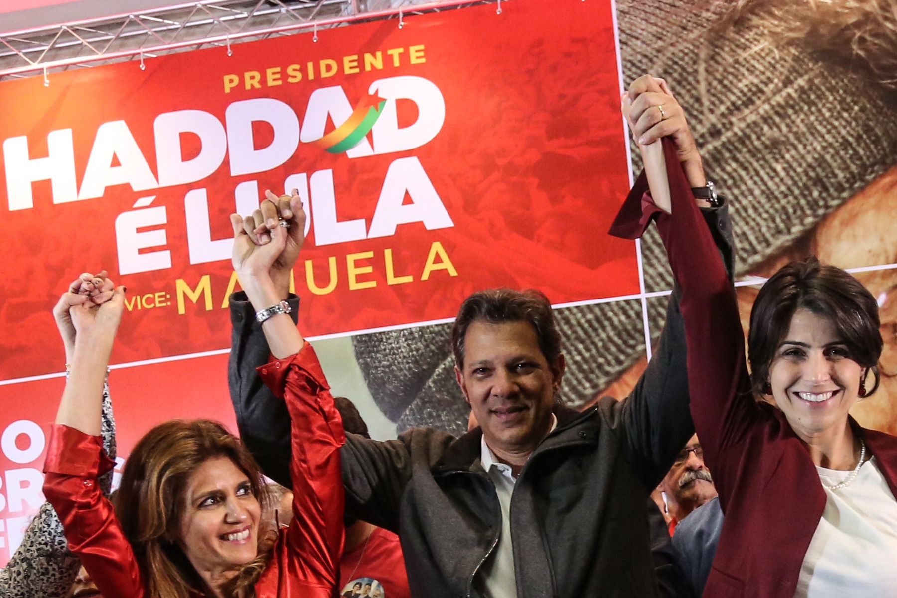 2018年10月7日,在巴西圣保罗,劳工党总统候选人阿达(中)得知总统选举计票结果后庆祝。(新华社发,拉赫尔·帕特拉索摄)