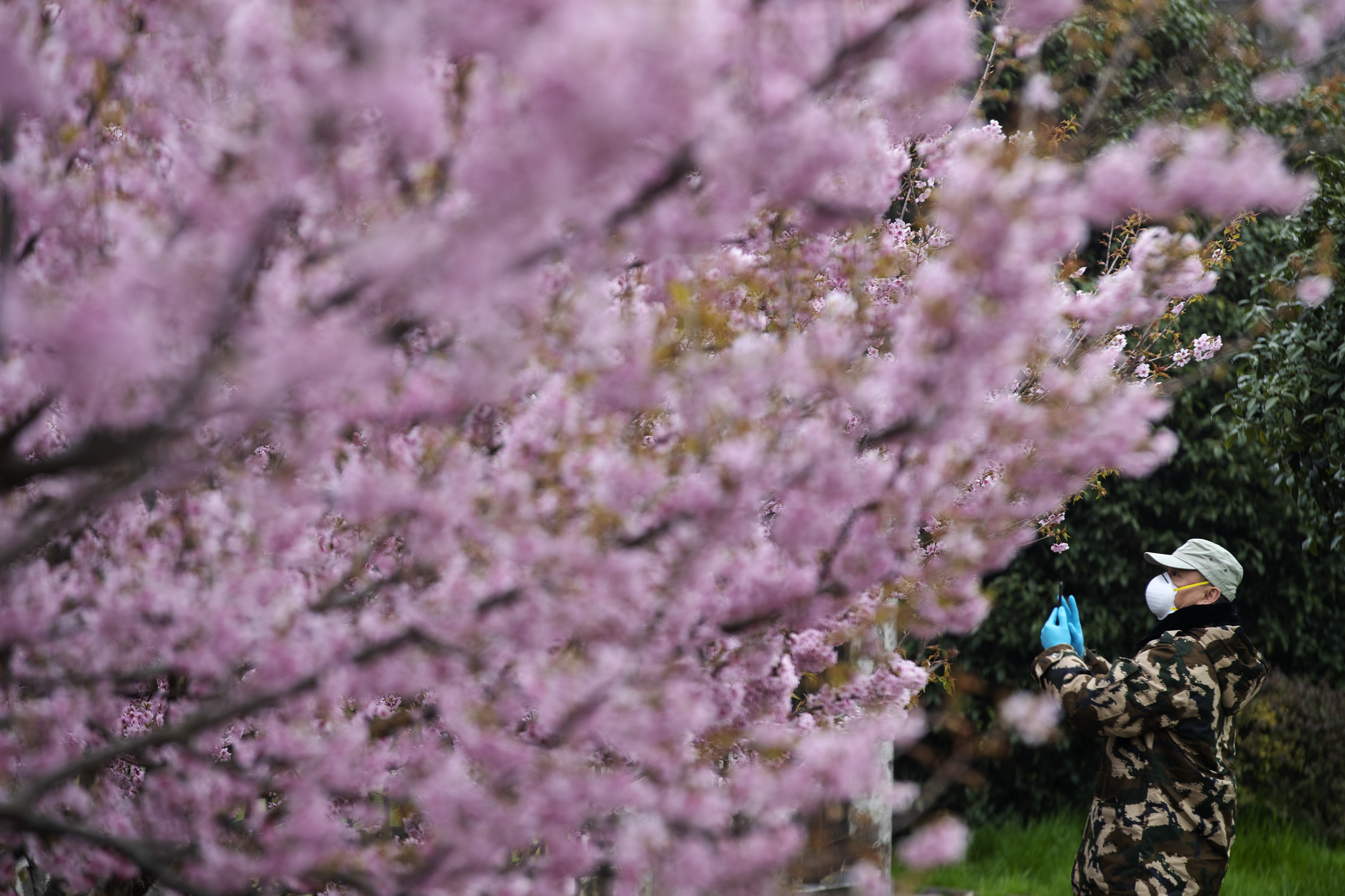 ↓2020年,盛开的樱花与渴望春天的人们之间有一堵隔离墙。