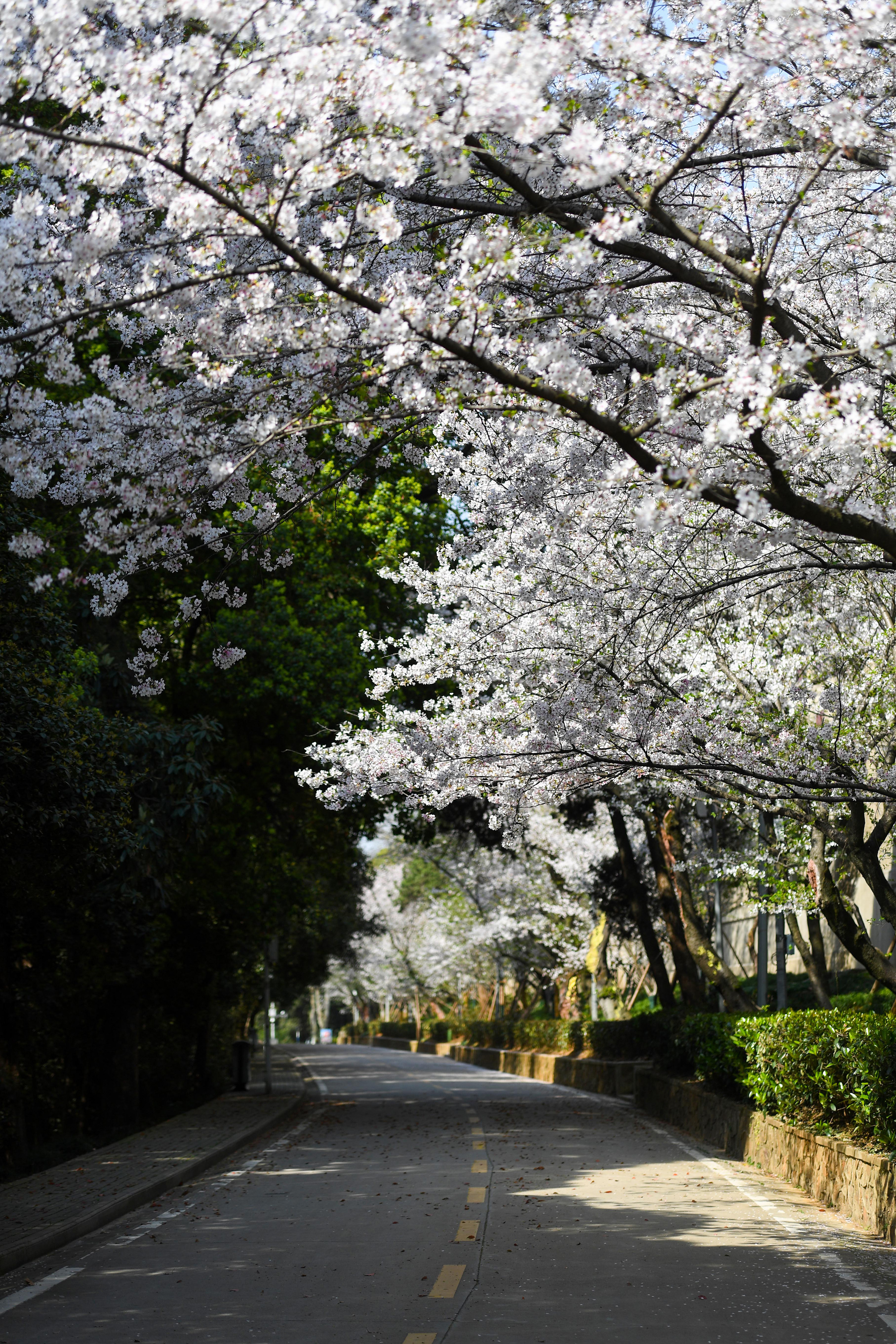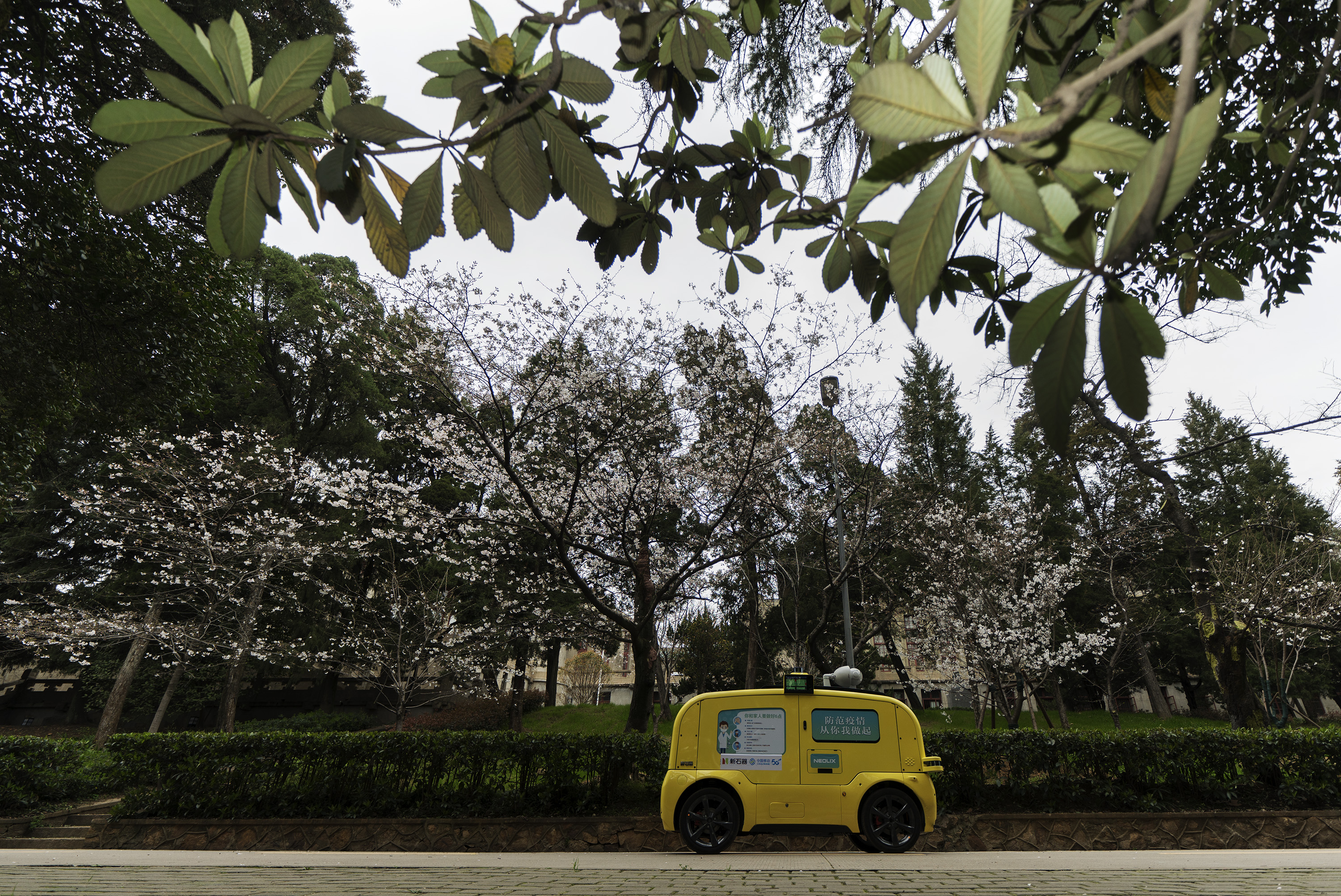 ↓ 2020年,樱花大道上,只有负责采集和传输直播信号的5G无人摄像车在武汉大学樱花大道进行不间断无人巡游,向全球媒体免费提供公共直播信号,全方位展示武汉大学的樱花季。