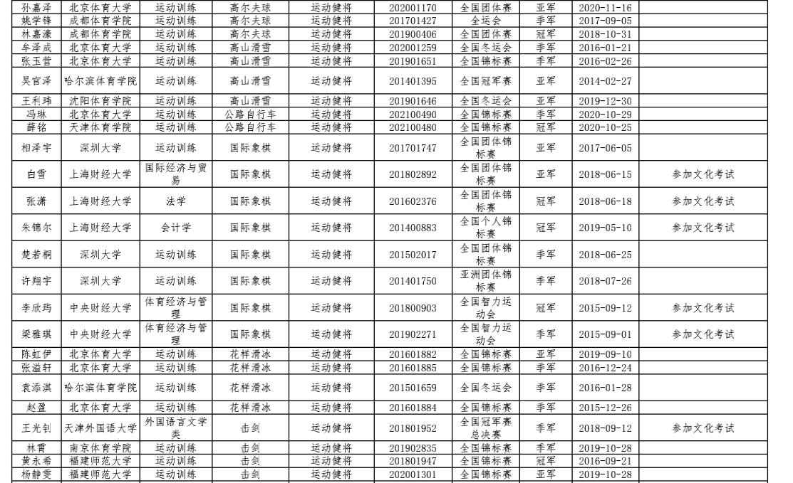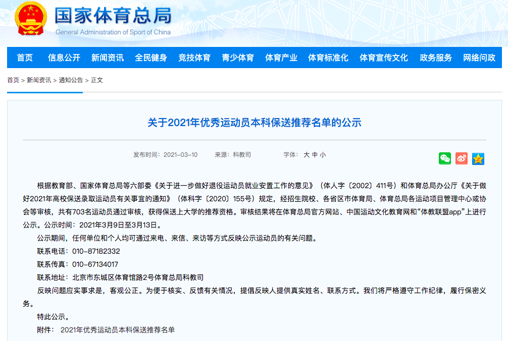 新华社北京3月10日电根据国家体育总局官方网站日前公布的《关于2021年优秀运动员本科保送推荐名单的公示》,今年共有703名运动员通过审核,获得保送上大学的推荐资格。