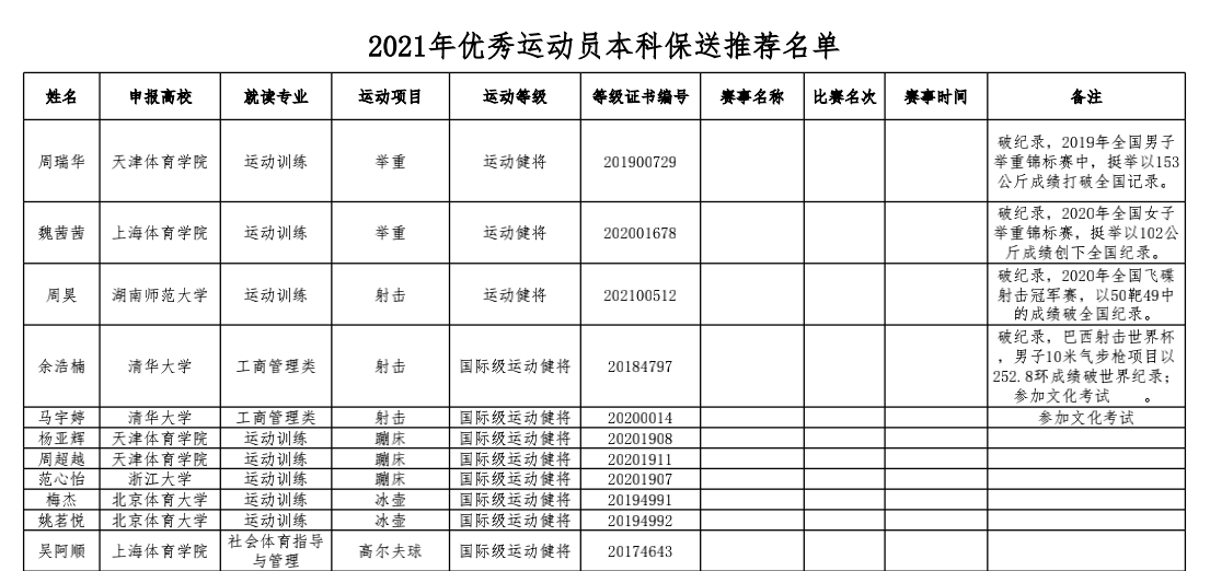 据了解,按照国家体育总局的规定,优秀运动员本科保送的成绩条件为能够满足以下任一条件:奥运项目破世界纪录、亚洲纪录或全国纪录(不含青年纪录);被授予国际级运动健将称号;被授予运动健将称号,且参加《2021年符合运动员保送条件的竞赛项目及赛事表》所列项目和竞赛,取得世界体育比赛前八名,或亚洲体育比赛前六名,或全国体育比赛前三名;被授予足球、篮球、排球项目运动健将称号。