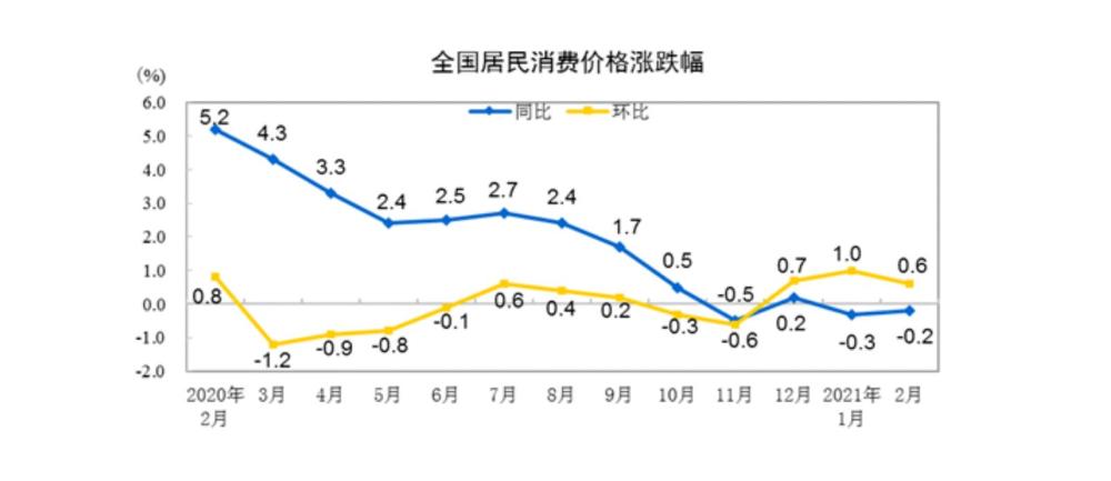 国家统计局10日发布的数据显示,2月份,全国居民消费价格指数(CPI)同比下降0.2%。