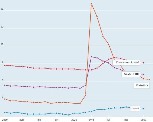 在其他经合组织成员国当中,墨西哥和加拿大在2021年1月的失业率分别环比增长0.2个百分点及0.6个百分点,韩国的失业率则环比上涨0.9个百分点达到5.4%,创下1999年10月以来的最高值。