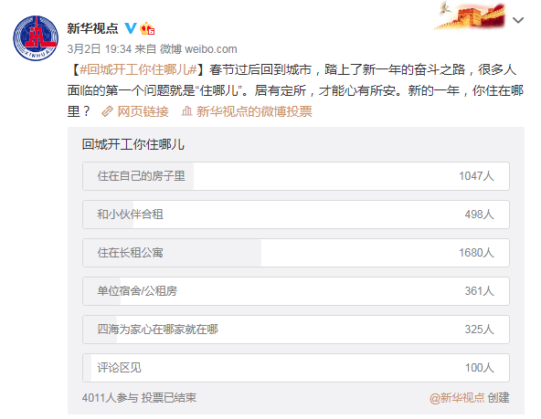 今年全国两会前夕,“新华视点”微博发起的一项“回城开工你住哪儿”的网络调查显示,参与调查的4000余人中,有1680人选择了“住在长租公寓”,占比超4成。长租房已经成为广大新市民、青年人的选择之一。
