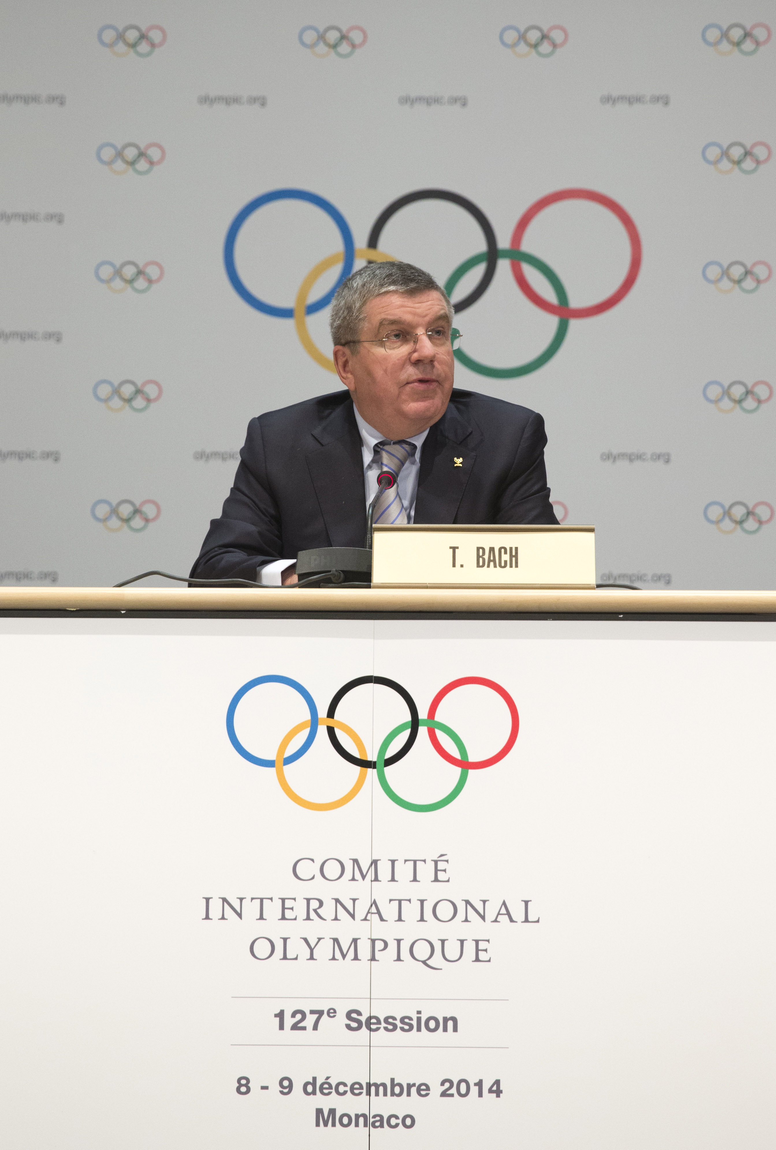 2014年12月7日,国际奥委会主席巴赫在开幕式上做主旨演讲。当日,国际奥委会第127次全会在摩纳哥开幕。新华社发(国际奥委会通联照片)