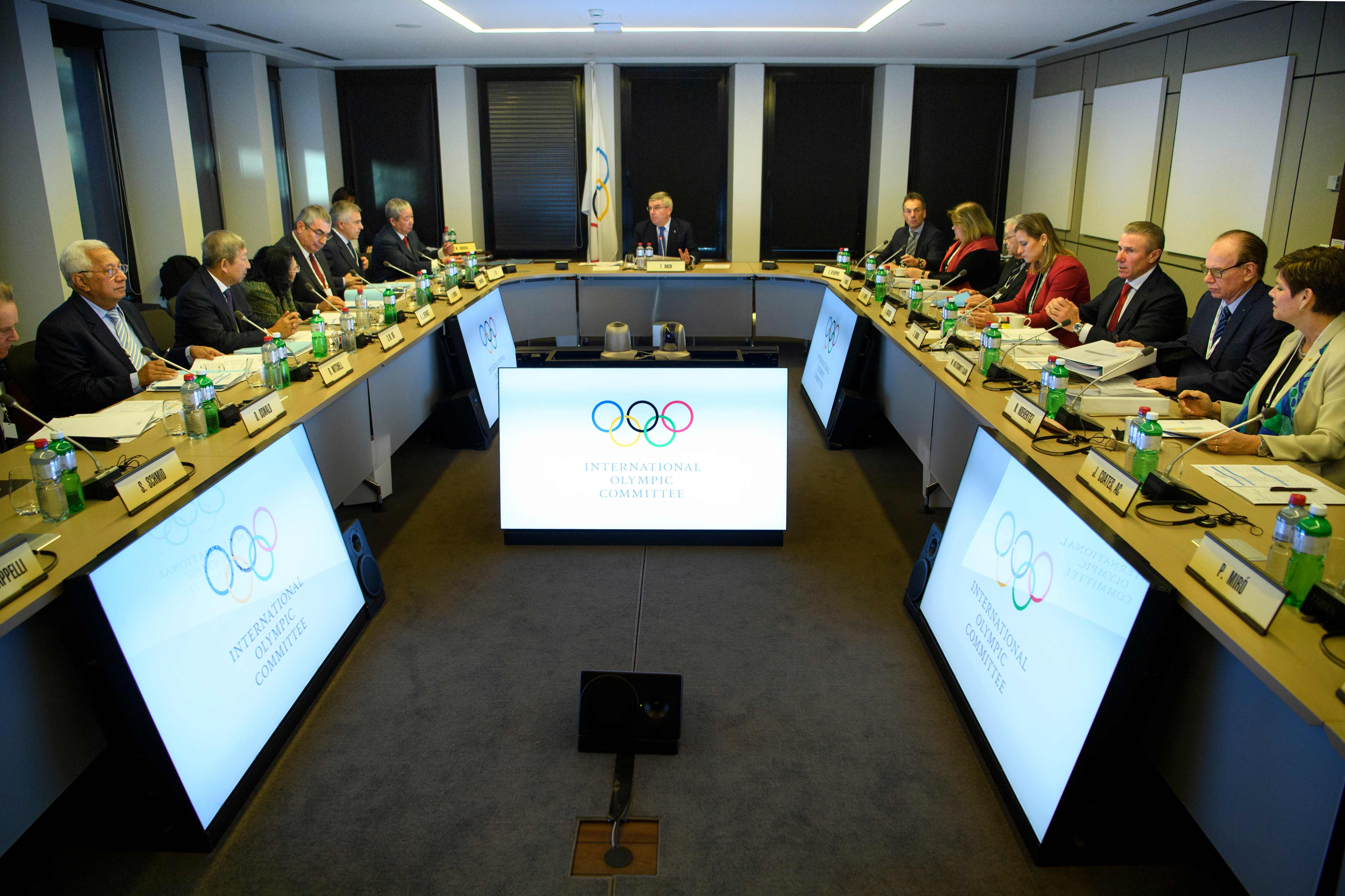 2017年12月5日,国际奥委会执委会委员在会上听取国际奥委会主席巴赫(中)的发言。俄罗斯运动员能否参加在韩国平昌举行的2018年冬奥会,成为本次会议的一个焦点议题。 新华社/法新