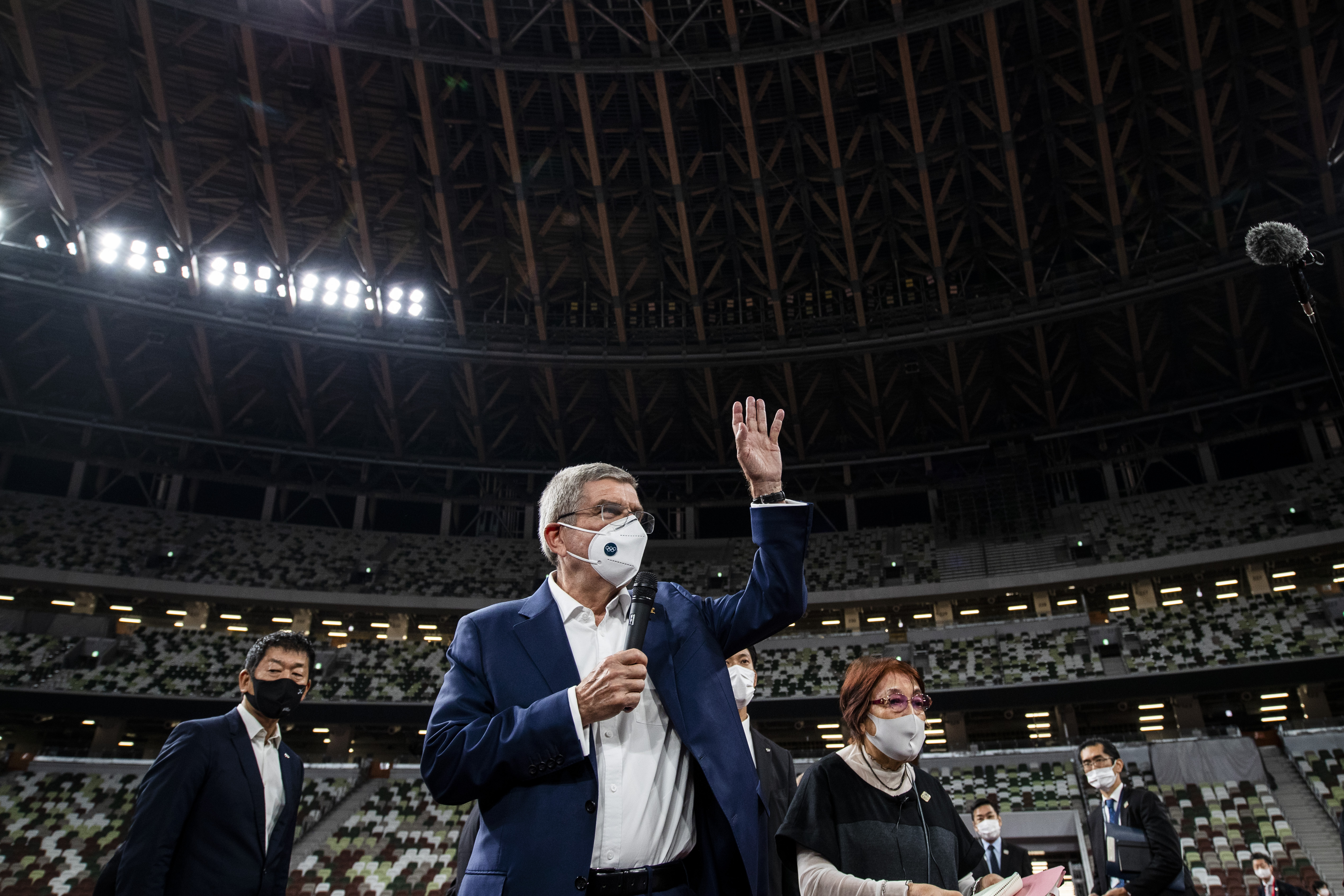 2020年11月17日,国际奥委会主席巴赫(左二)在参观新国立竞技场时向媒体记者挥手致意。当日,国际奥委会主席巴赫在日本东京参观作为奥林匹克体育场的新国立竞技场。新华社/POOL/贝赫鲁兹·迈赫里