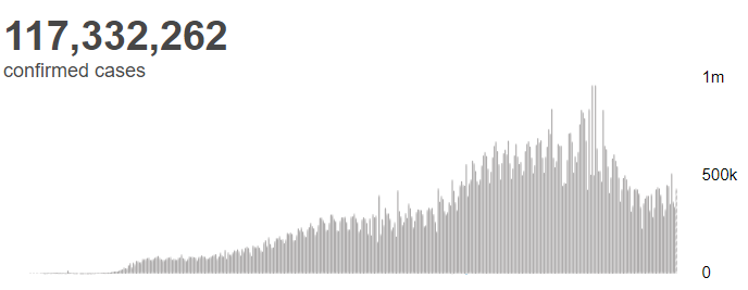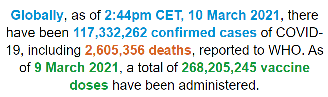 根据世卫组织最新实时统计数据,截至欧洲中部时间3月10日14时44分(北京时间3月10日21时44分),全球累计新冠肺炎确诊病例117332262例,累计死亡病例2605356例。10日全球新冠肺炎确诊病例新增433992例,死亡病例新增7413例。(总台记者 朱赫)