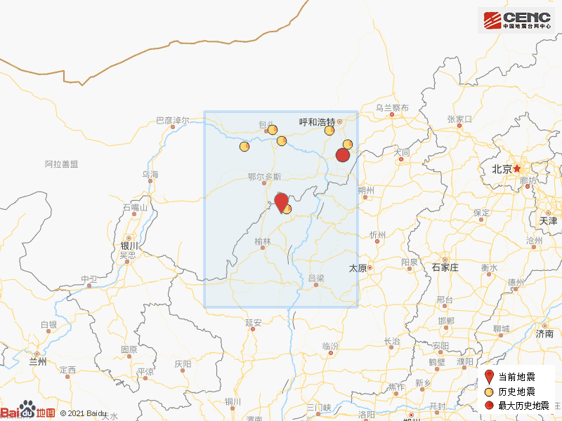 历史地震:根据中国地震台网速报目录,震中周边200公里内近5年来发生3级以上地震共8次,最大地震是2020年3月30日在内蒙古呼和浩特市和林格尔县发生的4.0级地震(距离本次震中182公里),历史地震分布如图。