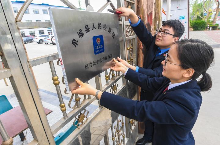 2019年4月23日,河北省阜城县人民检察院检察官在一家企业门口挂“民营企业法律服务站”的牌子,为经济发展履行保驾护航职责。 新华社记者李晓果摄