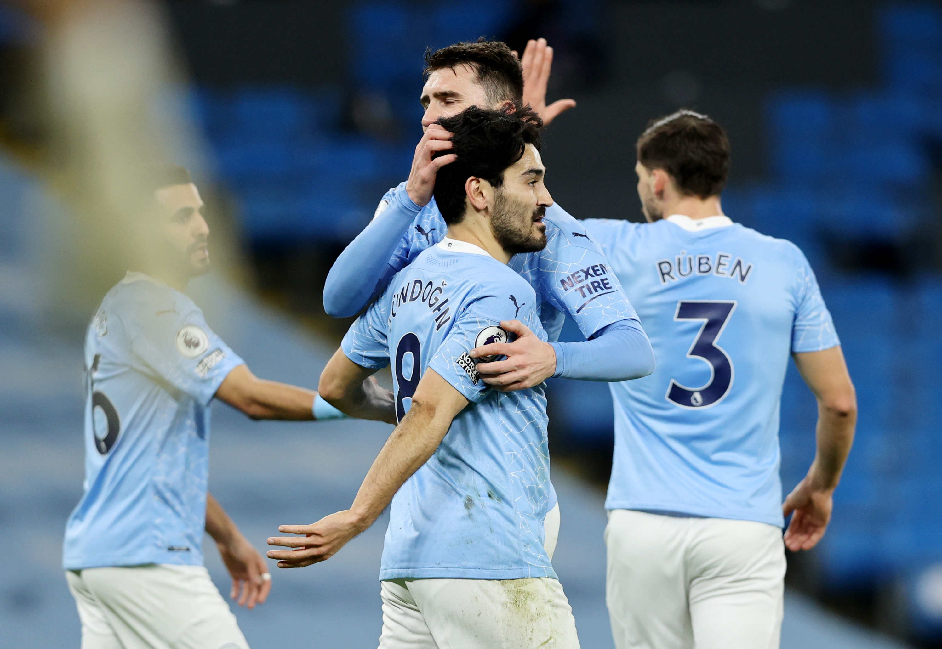 3月10日,曼城队球员京多安(前)在打进本队第三粒进球后和队友庆祝。新华社/路透