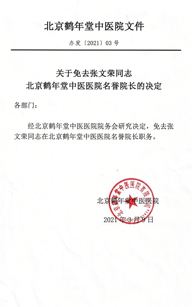 3月9日,北京鹤年堂中医医院曾发布声明,称张文荣为医院的出诊医生(多点执业医生,指符合条件的执业医师经卫生行政部门注册后,受聘在两个以上医疗机构执业的行为),其所有的宣传广告信息与医院无关,并免去张文荣荣誉院长的职务。