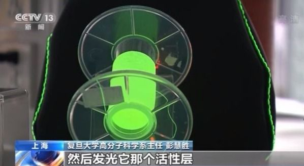 复旦大学高分子科学系主任 彭慧胜:我们实现了一个几十微米的这个活性层的均匀涂附。发光那个活性层,它只是在表面,所以它就是只要中间哪个地方断了,它整个就不亮了,所以我们先是在材料上进行了突破。