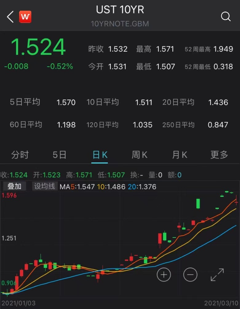 对于此次10年期国债的拍卖结果,彭博报道称,这一结果避免了市场的“灾难”。市场也给予了正面回应,据Wind数据,截至当地时间3月10日收盘,10年期美债收益率跌0.8个基点报1.524%,为连续第二个交易日回落。