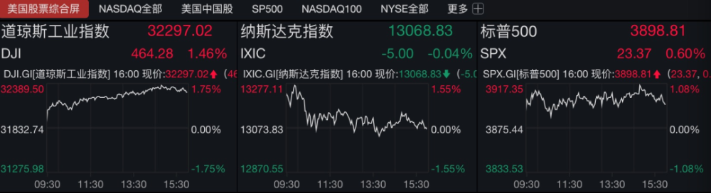 据Wind数据,截至收盘,道琼斯工业指数涨1.46%,报32297.02点,创历史新高;纳斯达克指数跌0.04%,报13068.83点,盘初一度涨逾1.5%;标普500指数涨0.60%,报3898.81点。