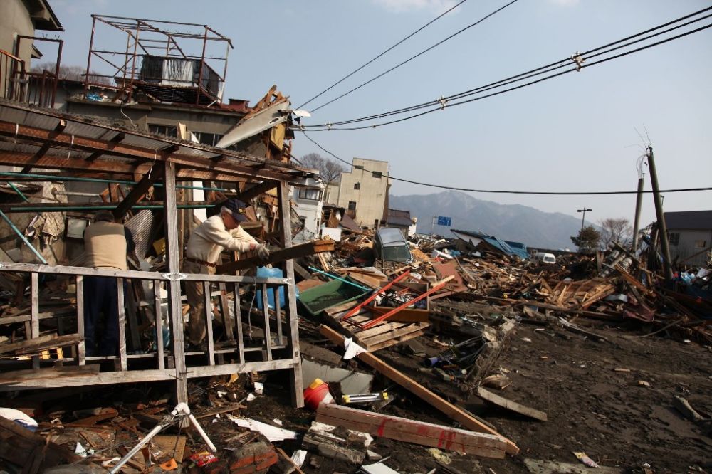 2011年3月13日,在位于日本东北地区的岩手县宫古市,一名当地居民清理废墟。(新华社记者张金加摄)