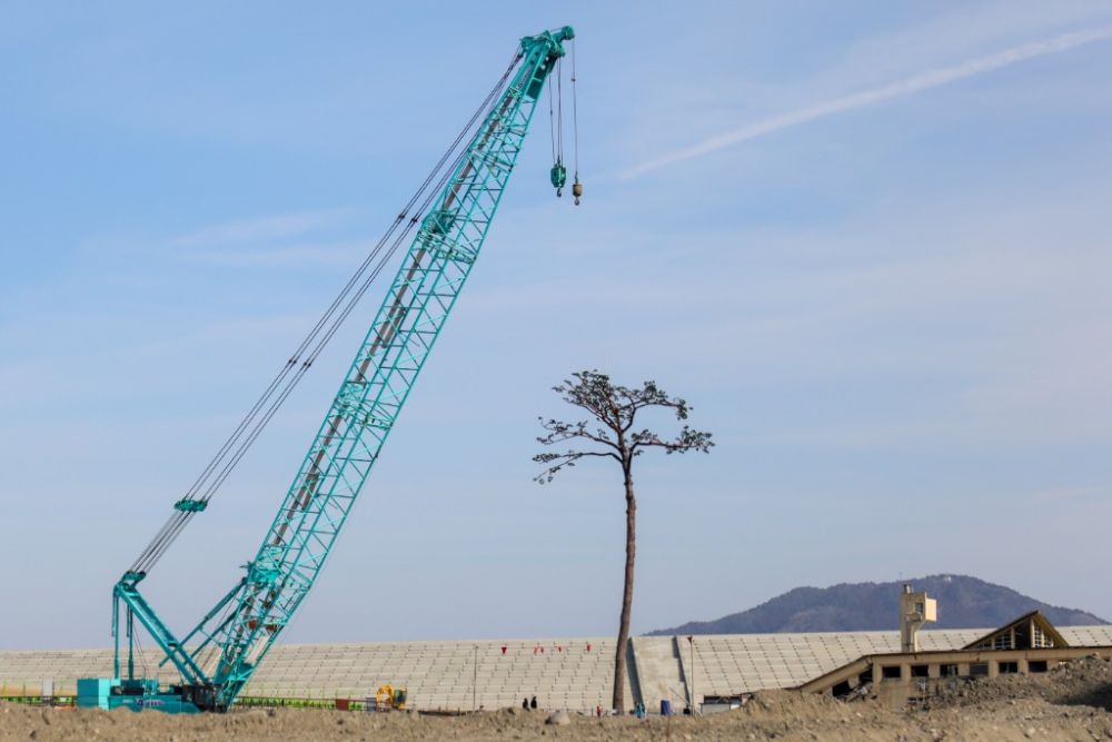 这是2019年3月10日拍摄的日本岩手县陆前高田市的“奇迹一棵松”,背后为新修建的防潮堤,旁边为地震海啸遗迹。(新华社记者马曹冉摄)