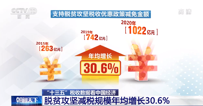 央视网消息:除了支持创新,在减税的大盘子中,还有不小的一块是用在了脱贫攻坚上。数据显示,“十三五”时期,我国脱贫攻坚减税规模年均增长超过30%。