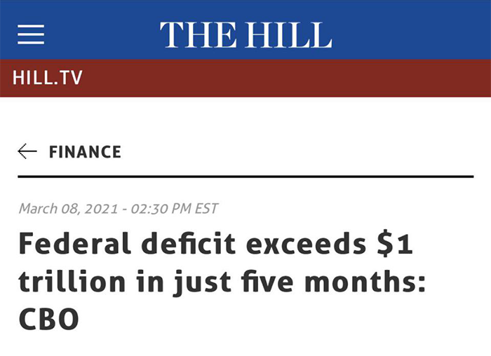 △《国会山报》报道,美国国会预算办公室报告:2021财年的前五个月中联邦政府财政赤字已超过1万亿美元