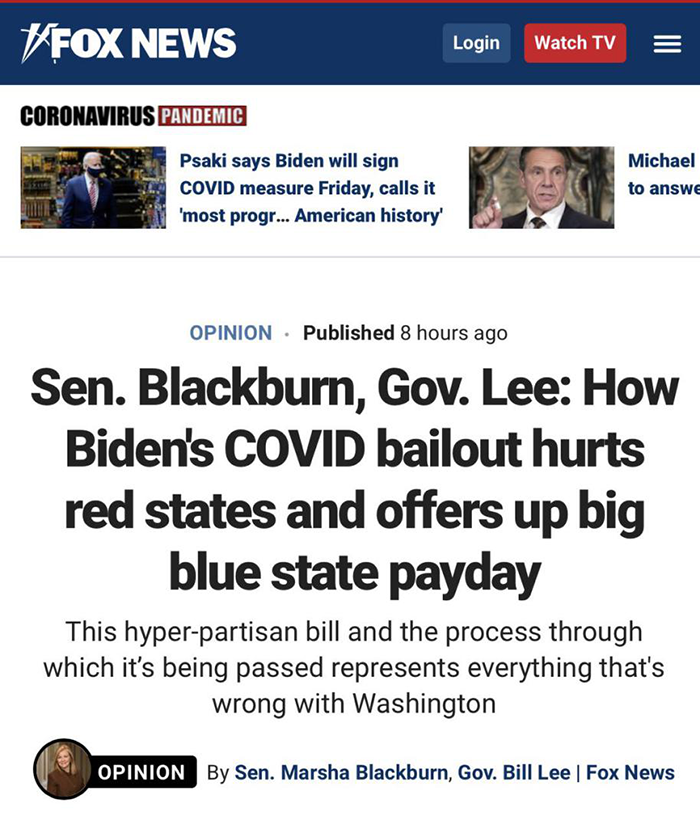 △福克斯新闻报道,参议员布莱克伯恩和田纳西州州长比尔·李表示,拜登的刺激法案伤害了红州(共和党州)并给予了蓝州(民主党州)巨额资金支持