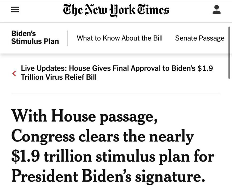 △《纽约时报》报道,美国国会众议院投票通过了新一轮经济刺激法案,只待拜登签字即可生效