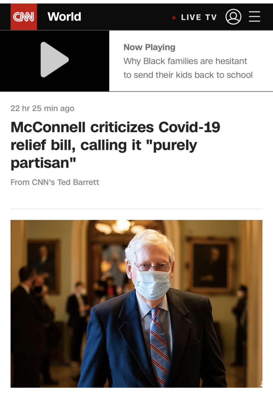 △CNN报道,参议院共和党领袖麦康奈尔称新一轮刺激法案是民主党“一言堂”的产物