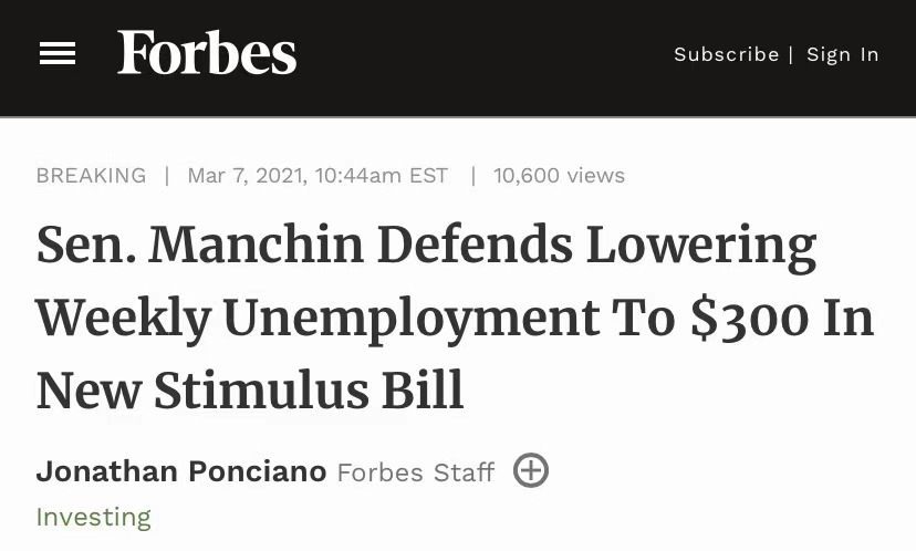 △《福布斯》报道,参议员曼钦认为降低失业金至每周300美元是合适的方案
